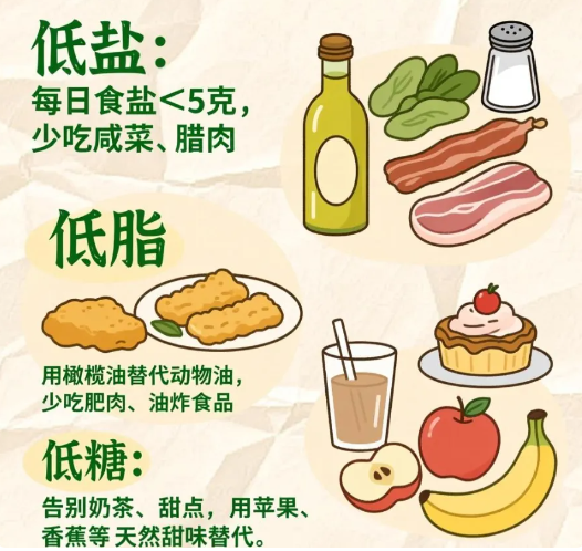 低盐(每日<5克)、低脂、低糖,高纤维,推荐每天摄入25-30克膳食纤维。