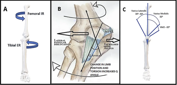 股骨前倾角过大/胫骨外旋:导致下肢力线异常,间接增大Q角。