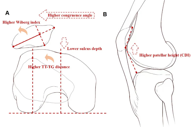 滑车沟角:在轴位X光片上测量,角度越大,说明滑车越浅,越不稳定。